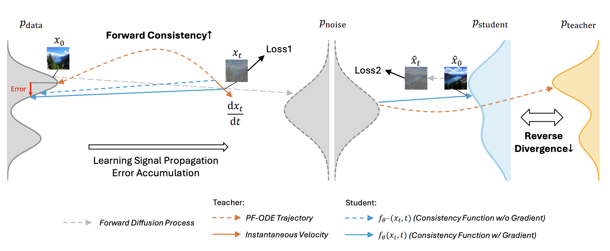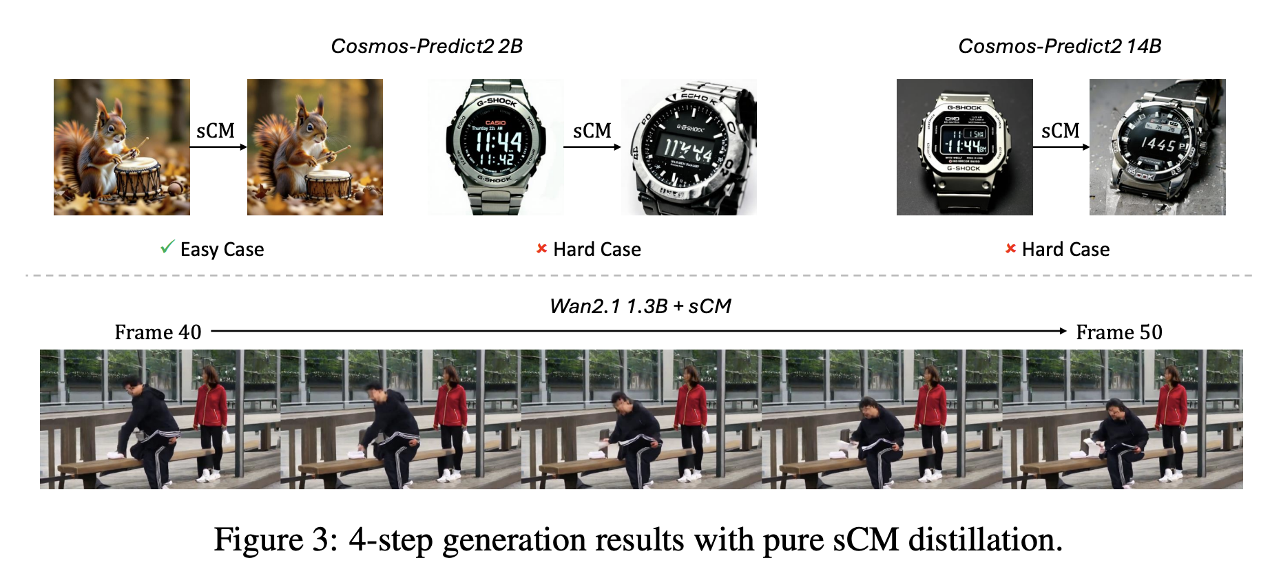 sCM蒸馏总是在一些典型提示上做得很好,但是在一些复杂提示上,指令遵循下降,并且无法通过简单的scale up来解决,可以发现这里是存在一个误差累积的问题,构成误差累积的因素有很多,比如CM的目标是在one step去拟合教师模型的ODE流,但是此时如果产生一点偏差,在后续步骤中该偏差会被放大