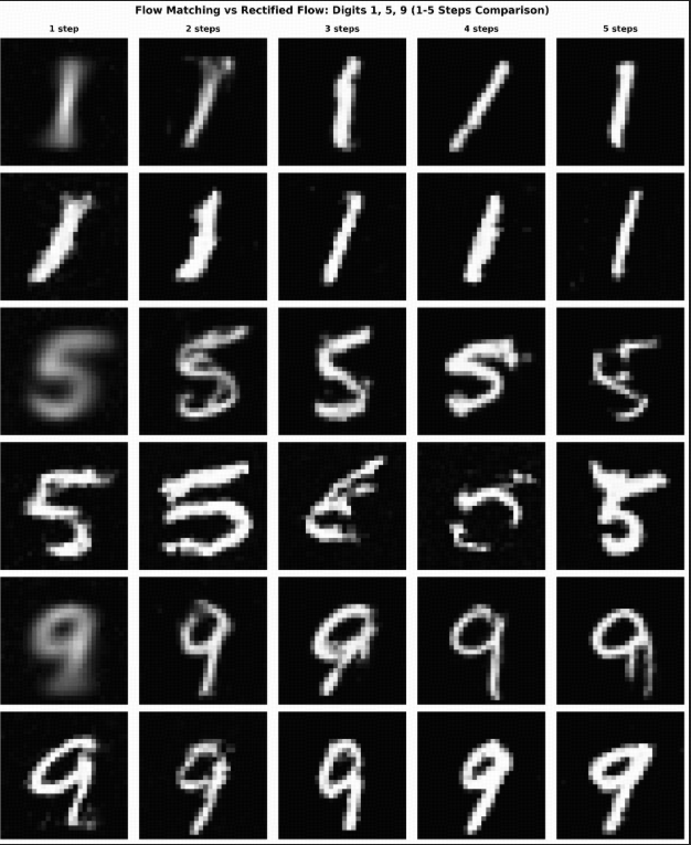 这是我在Minst数据集上的训练结果,因为数据集比较简单,所以在2步以上的去噪中就显得区别不大,但是很明显的,ReFlow的模型可以在第一步去噪中就得到很好的结果