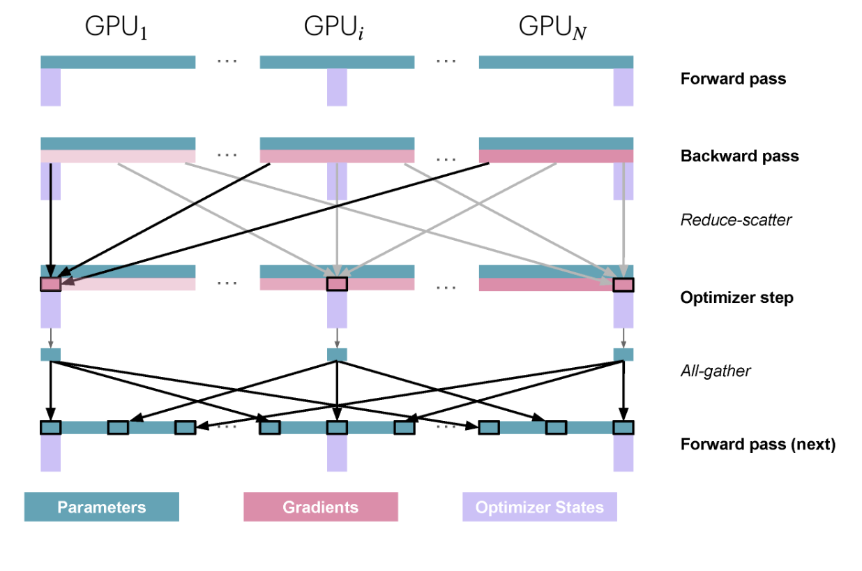 zero1的过程如上,在梯度规约的时候,不再做All Reduce,而是做Reduce Scatter,只在每个GPU上计算属于自己的那份累积梯度,而在最后权重更新的时候,每个GPU只更新自己需要更新的权重,然后把自己更新好的权重同步给其他GPU