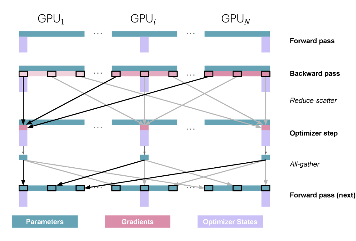 在Zero1中,优化器状态被分为N份,每个GPU上都只维护1/N份优化器状态,更新的时候只优化对应的FP32权重,而在部分更新完成之后,通过一个all-gather操作,将各个GPU上的参数都更新到最新状态