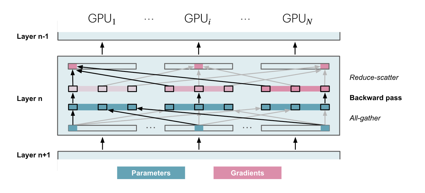 DeepSpeed 中的Zero3和Pytorch中的FSDP是等价的,它将对于梯度和优化器状态的操作复刻到了参数上,我们在需要参数的时候就收集它,因为我们会将一层参数拆分到不同地方,因此进行Zero3的时候需要经常gather