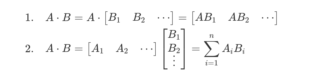 这个时候就是要提出我们的TP了,张量并行,张量并行的原理来自于矩阵乘法的性质,因为LLM计算中大部分操作均为矩阵乘法,对于矩阵,我们的操作主要是对于矩阵列和行进行独立的操作,因此如果对于行和列进行分割,就可以顺利完成矩阵乘法