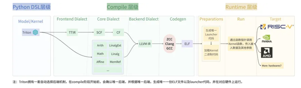 Python DSL层级,只是做一系列的表述,并不实际执行kernel,在Compile层级将抽象出来的Python表示转换成可执行的代码形式,随后在Runtime层级跑起来