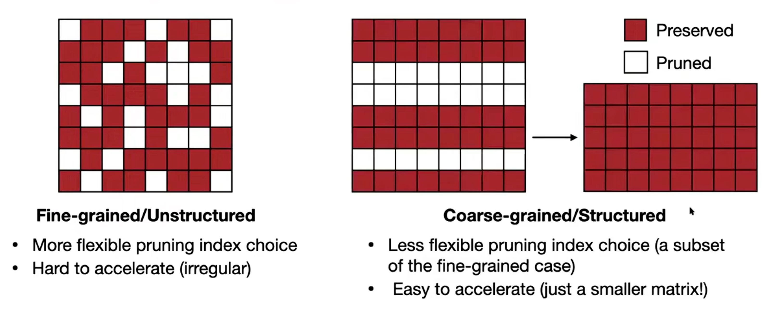 - Coarse-grained/Structured 粗粒度的剪枝,对于一整行/列去剪枝,然后压缩成密集矩阵,其优缺点于前者正好相反