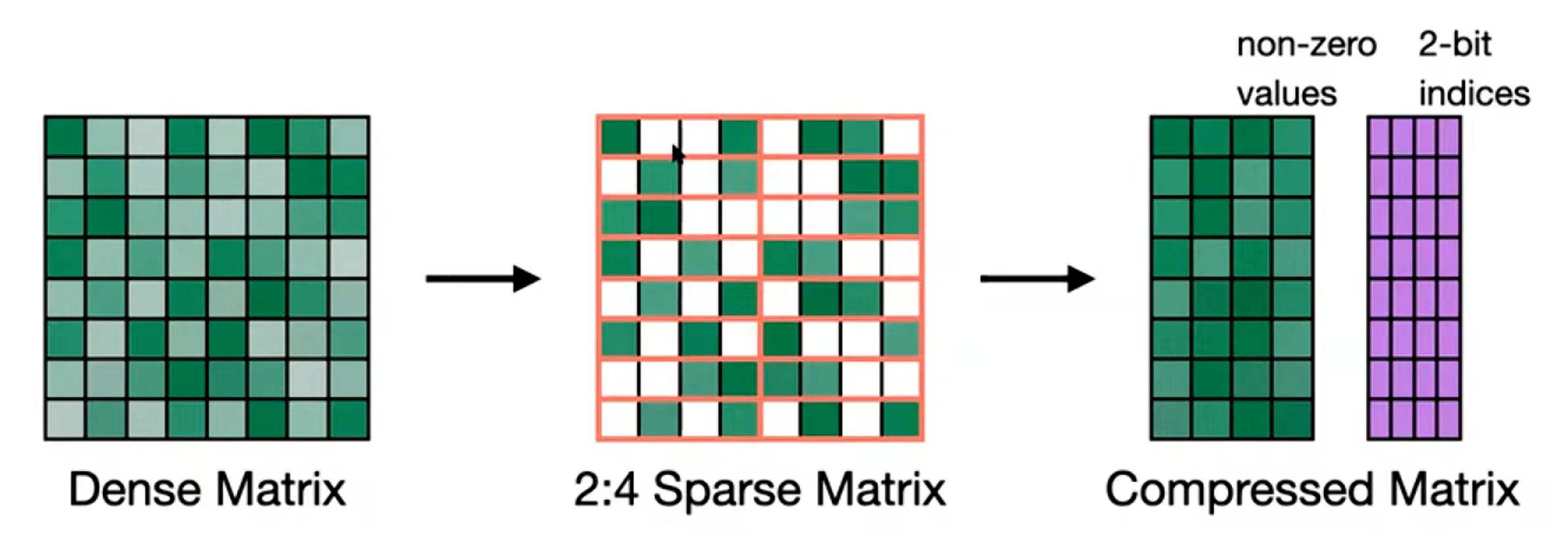 比如第二种Pattern-based Pruning,就是在为剪枝的的时候引入一种规律,使其可以有效加速,比如2:4 Sparse Matrix(这是A100 GPU中特别优化过的算法)