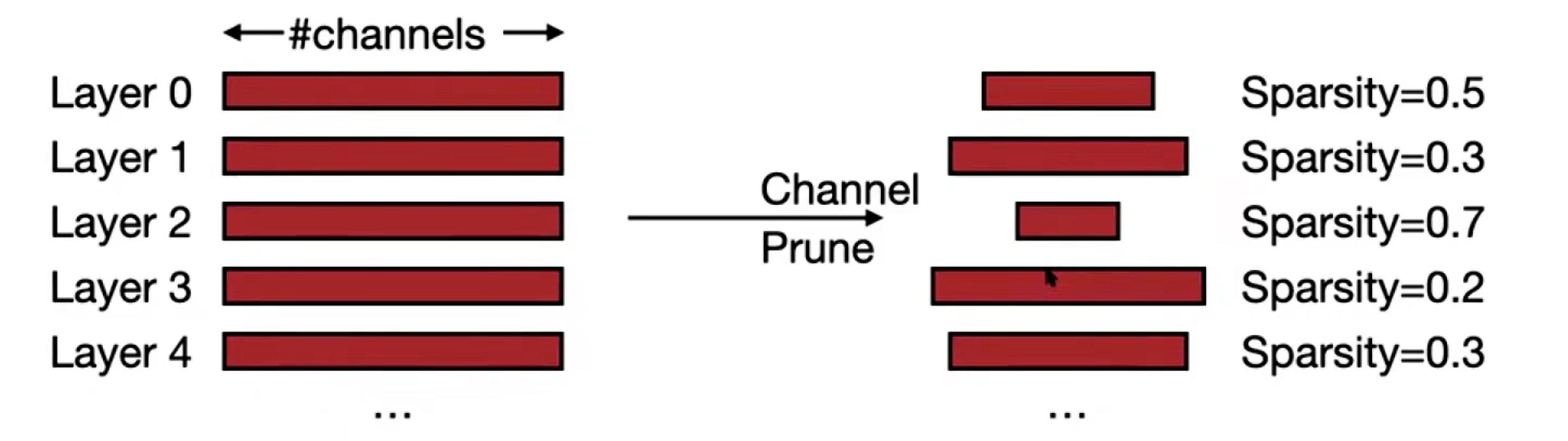 再比如Channel Pruning,这是相当粗粒度的剪枝,相当于剪掉了一整个通道,对于神经网络而言,会变成如下这样子。在这些例子中,如何确定稀疏度的大小,也是一个需要考量的范围。随机选择每层的稀疏度并不是一个好的选择