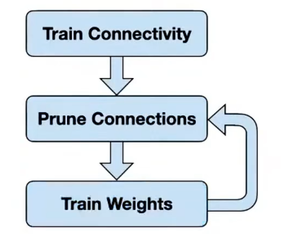 剪枝的常规流程分为两步,一个是删减掉模型中的一些connections,随后进行第二次训练,使得其性能恢复到原有水平