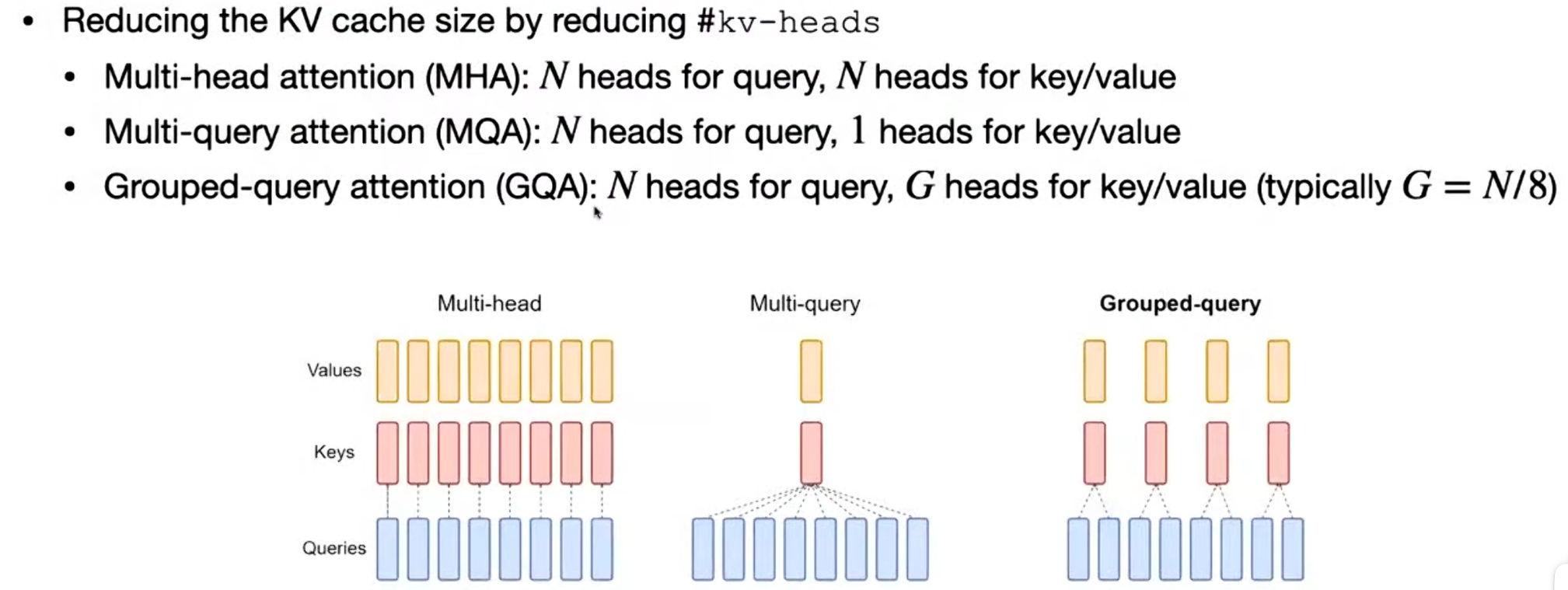 这些方案是在Attention Head上做处理,通过减少Attention Head的数量,来减少KV cache的存储,标准的MHA的我们有h个Attention Head,也就有h个QKV,MQA做的比较极端,我们只有一个KV权重,但是有h个Q权重,因为Q的计算是逃不掉的,但是这种做法过于极端导致性能较差,GQA就相对做得更好,我们让几个Q权重共享一个KV权重,这样子可以做到一个比较好的权衡