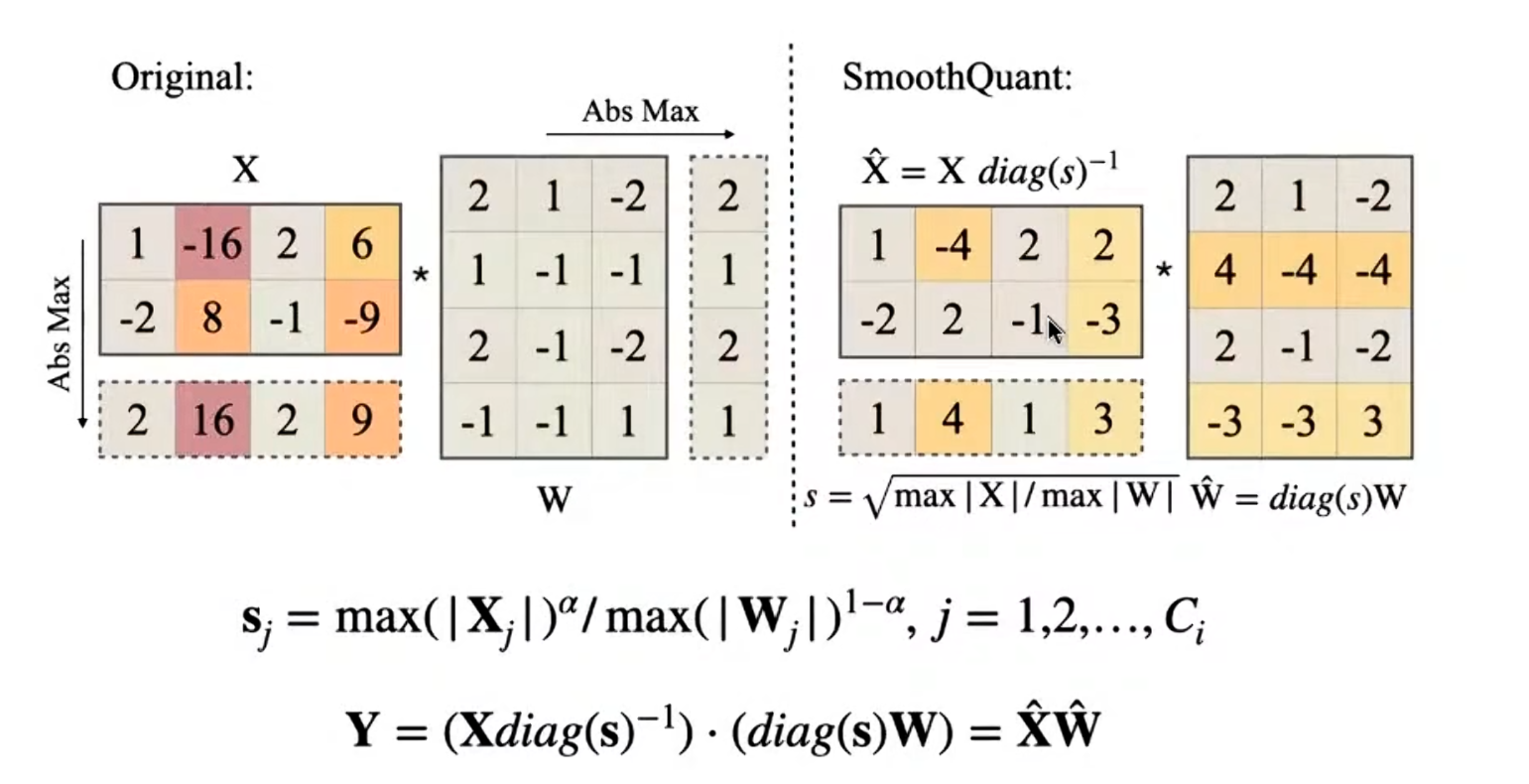 针对此种现象我们可以采用一种对应的量化方案,就是将激活值中的较大的部分缩小,将对应的缩放因子转换到它们要计算的weight中,使得对应的权重扩大,就是将100x1变成10x10,在保证结果不变的情况下尽可能消除异常值