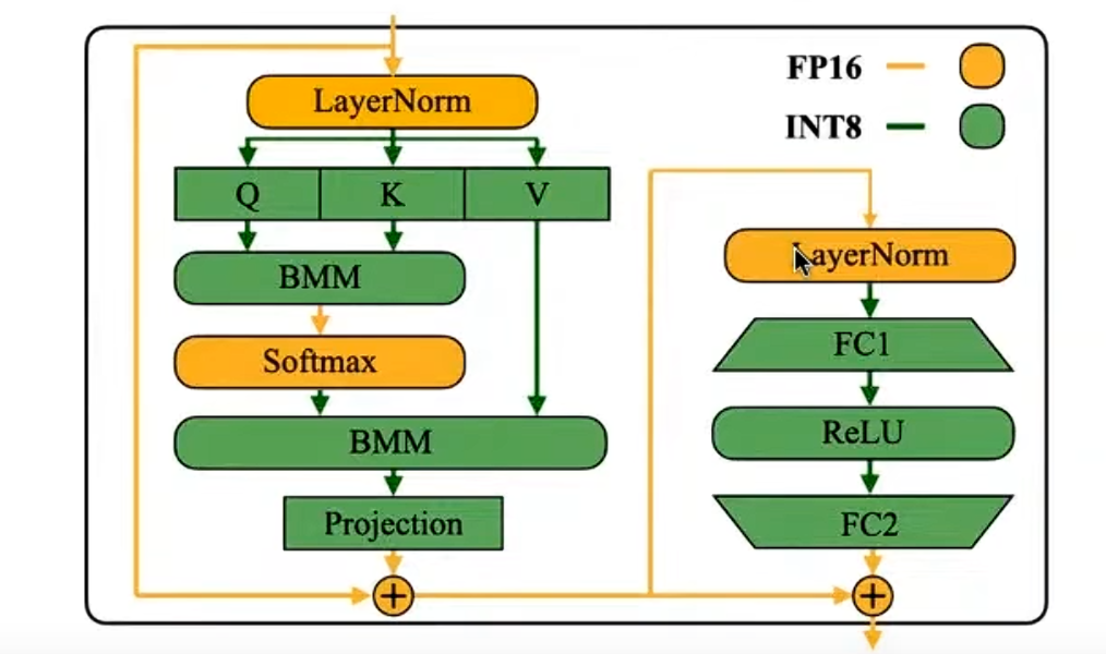将量化的压力在激活值和参数中取得一个平衡时一个比较好的方案,这种称为Smooth Quantization的方案,在具体的Transformer实现中如下