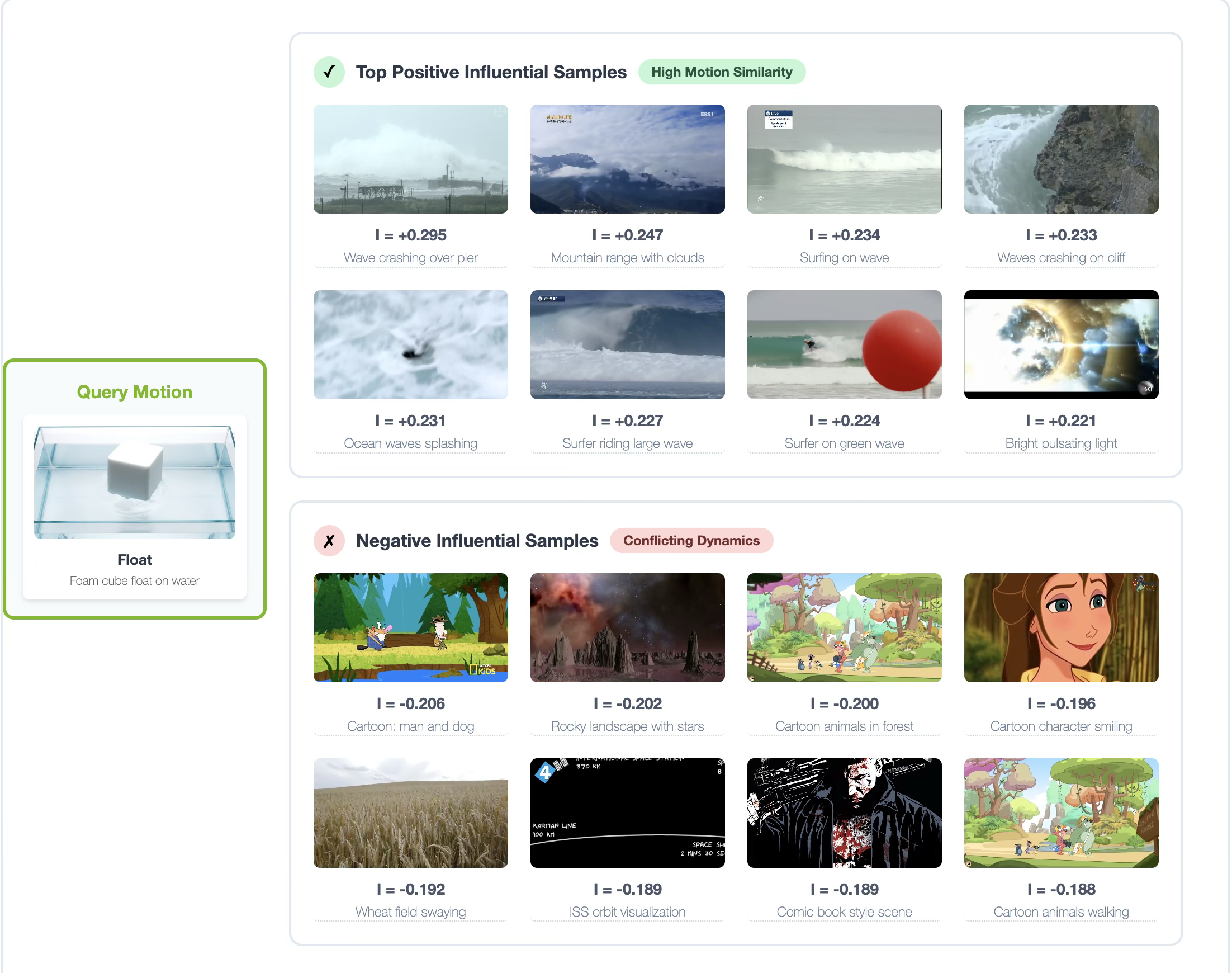 其做法是,首先我们有个query data,这是我们想要优化的一个动作,比如是漂浮这个现象,我们要根据这个现象去找到训练数据集合中与其正相关的数据,那么怎么找呢,就是对于两个视频都求diffusion model的梯度,先计算MSE Loss,然后对这个Loss进行一个运动的Mask遮罩,后续的梯度计算中只关心正在运动的物体,这样子计算出来的梯度就是和运动相关的,然后再把这两部分的梯度,计算相似度,就可以得出相应的正负效果