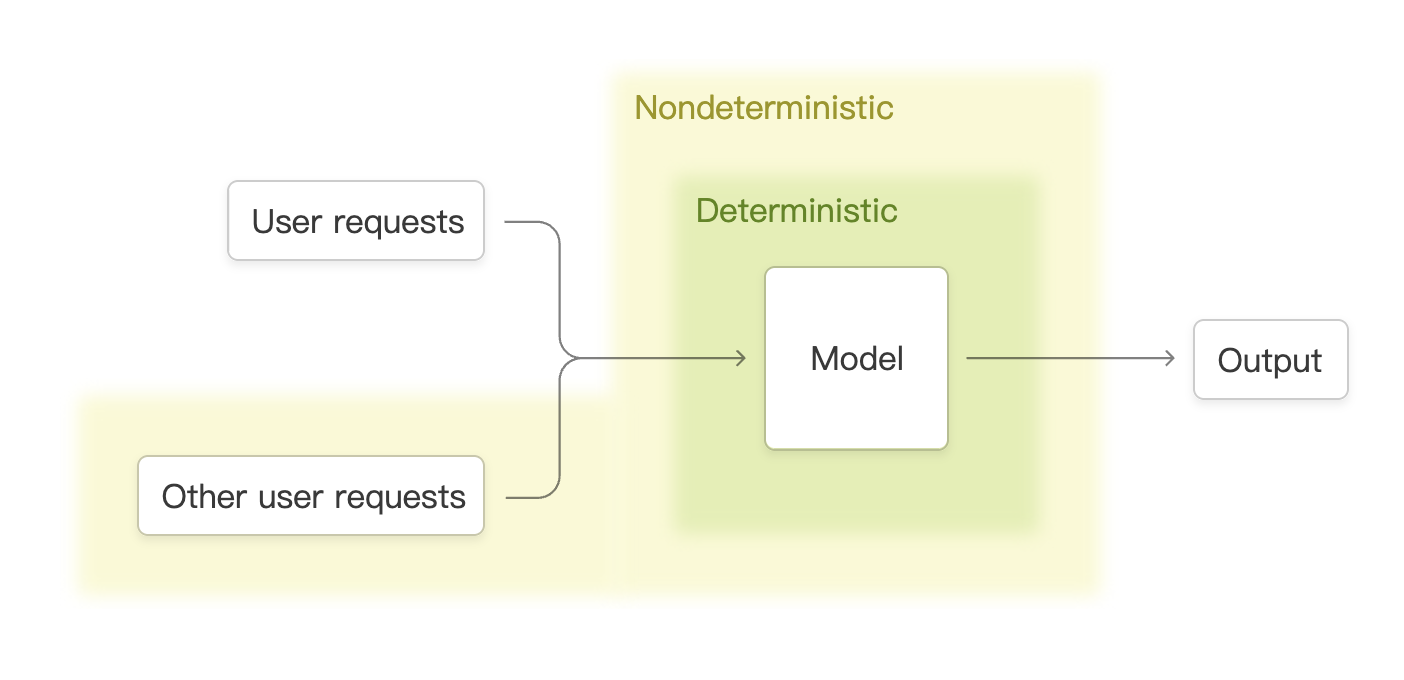 - 人们往往认为将LLM call的temperature调整为0就可以将LLM转化为一个稳定的映射,但事实并非如此,之前人们往往将其归因为硬件计算的一些不一致性,比如在硬件计算上,浮点数是不符合结合律的