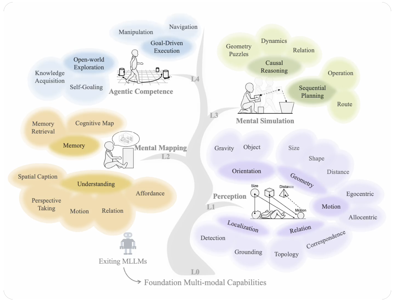 - 这篇工作形式化了对于空间智能的理解,主要针对的是多模态理解能力,其用四个层级来描述模型的空间理解能力,并且对此构建了Benchmark