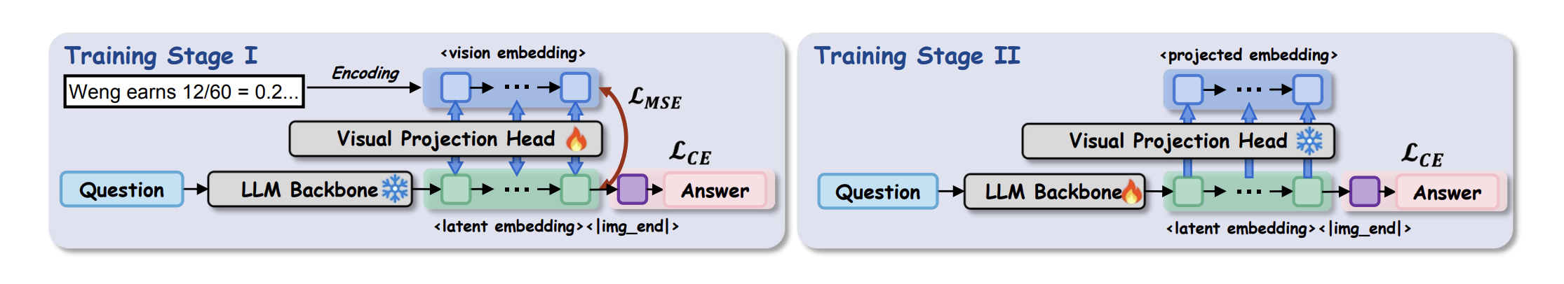 - 这篇文章的训练分为两个部分,一个是训练一下对齐,让VLM会输出连续向量,并且作为监督的输出是转换成图像的文本思维链,第二部分是正式的训练,正式的训练不对思维链做监督,只对输出的结果做监督