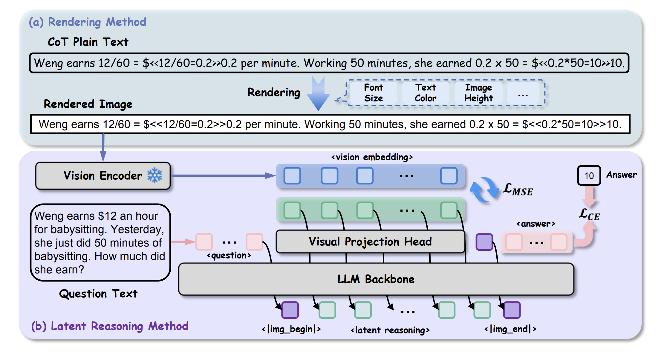 但是我个人认为这个方案做得不好,因为它用的是VLM的encoder,这个encoder没法做重建,所以其同样无法将中间的Cot显示出来,只能通过之前一些人们分析image latent space的方案来分析Cot,应该用具有重建和理解能力的encoder才对,甚至我觉得现有的vision encoder未必适合这个任务,带重建和推理的Loss重新训一个encoder或许是解法