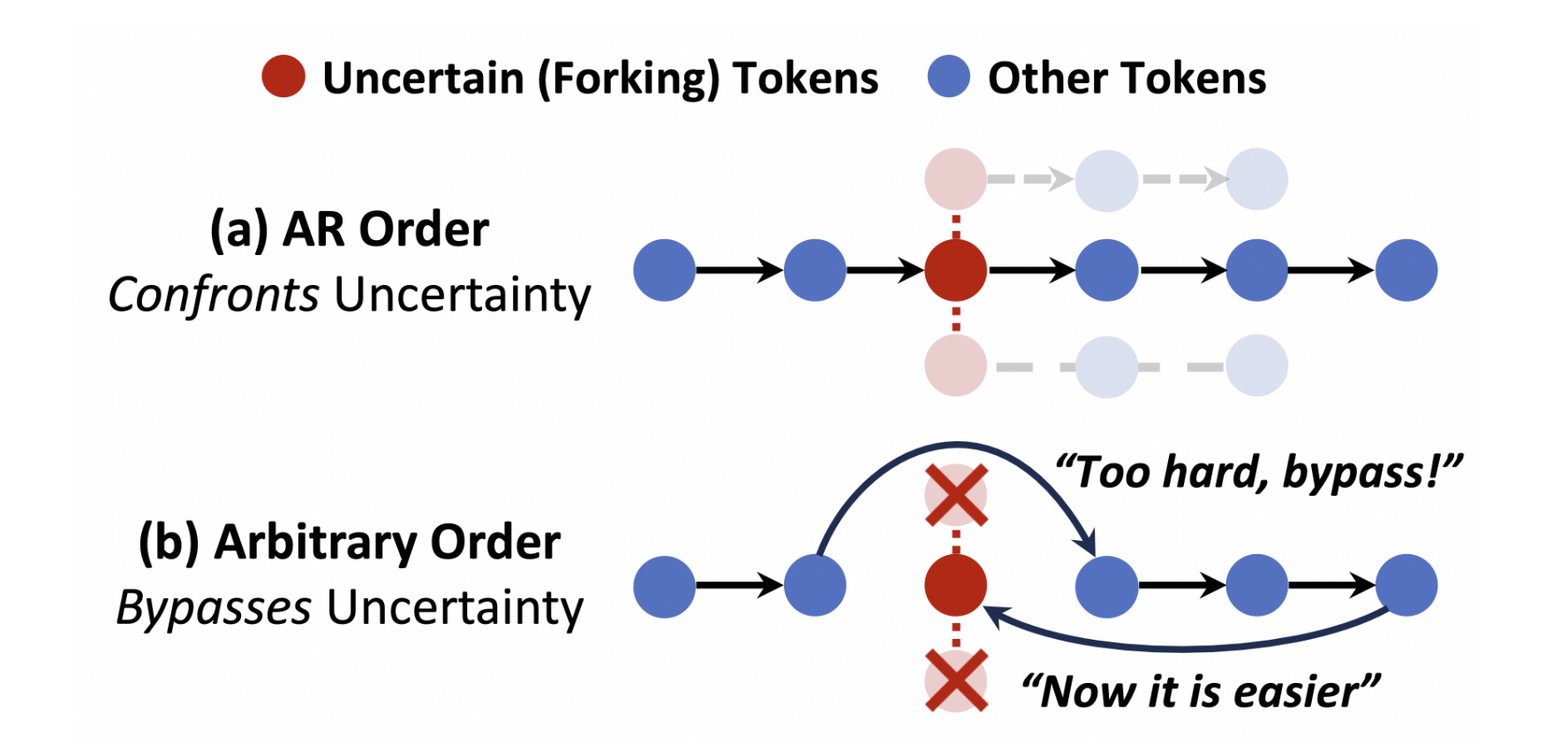 - 这篇论文展示了Diffusion LLM声明的任意顺序生成的优势,其实在训练的时候会引入问题,一个合理的解释是这样的,严格的AR模型,让模型在生成中直面不确定性,因此会有低置信度的token生成,但是在diffusion llm的随机生成中,模型会学习机制优先生成置信度更高的后续token,而通过这些生成的前后token的双向注意力下,中间那个本身是低置信度的token此时的探索空间就被限制了