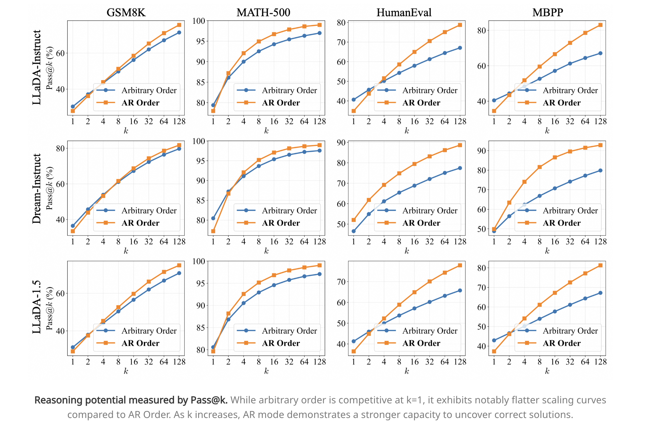 上述思路导致的结果就是,diffusion llm在相同的情况下,pass@k的性能不如ar模型,看似自由的生成顺序反而限制了探索空间