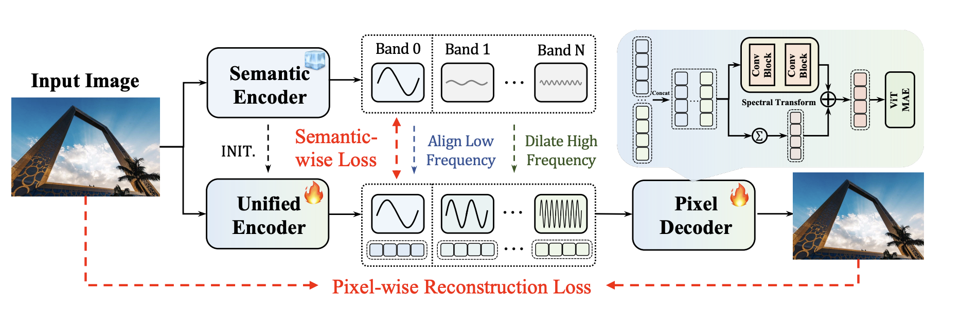 并且本篇论文提出了一种相应的Unified AutoEncoder的训练方案,同时优化Semantic Loss(依靠一个教师模型)和Pixel Reconstruction Loss(直接重建),其是靠将DINO的初始化整个模型,然后将DINO的输出给按频率拆分,低频率部分采用一个重建的Loss